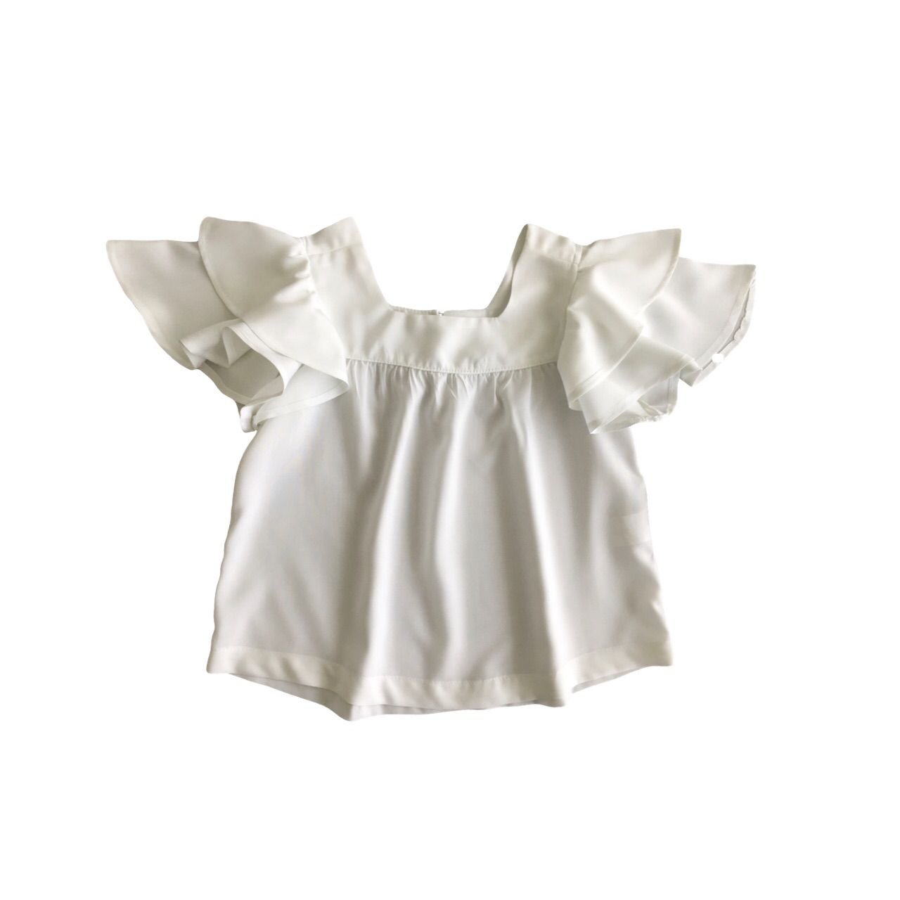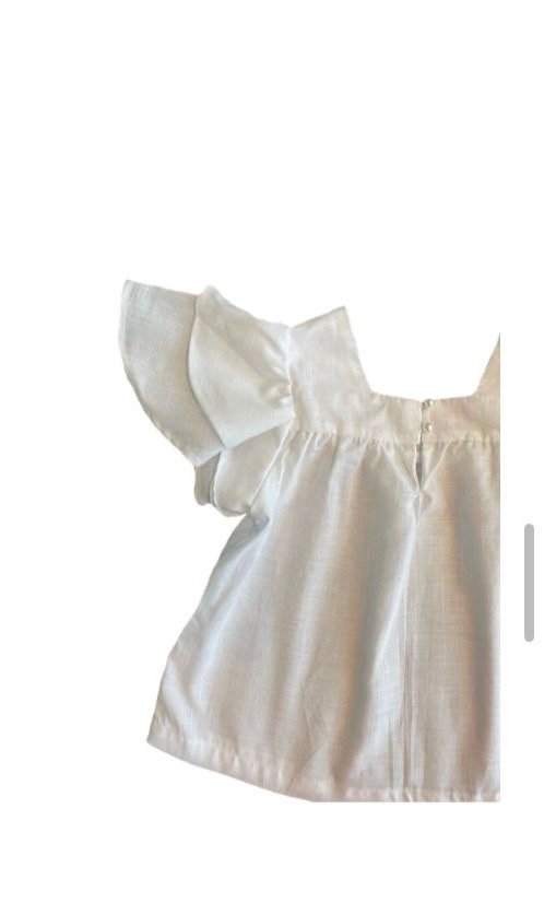 . Peça em Viscose de algodão, com detalhes em dois babados nas manguinhas, pala na altura do pescoço e abotoadura nas costas.