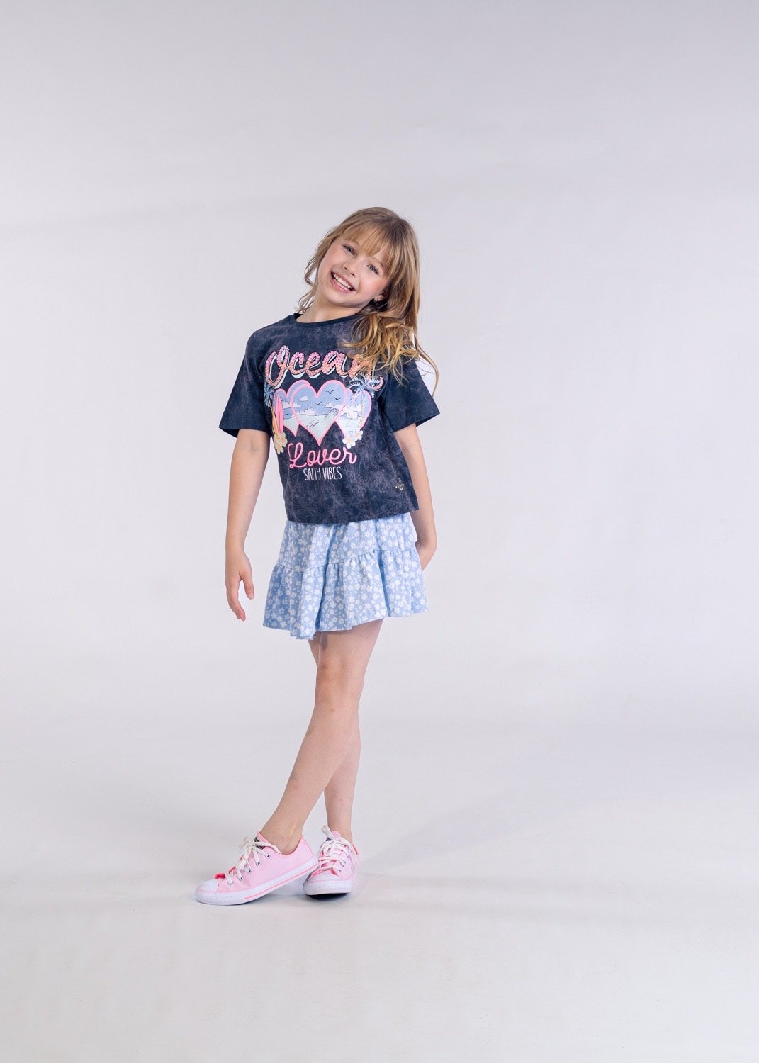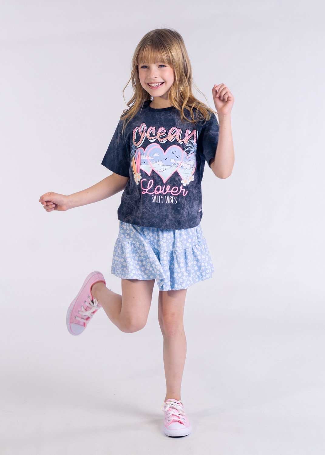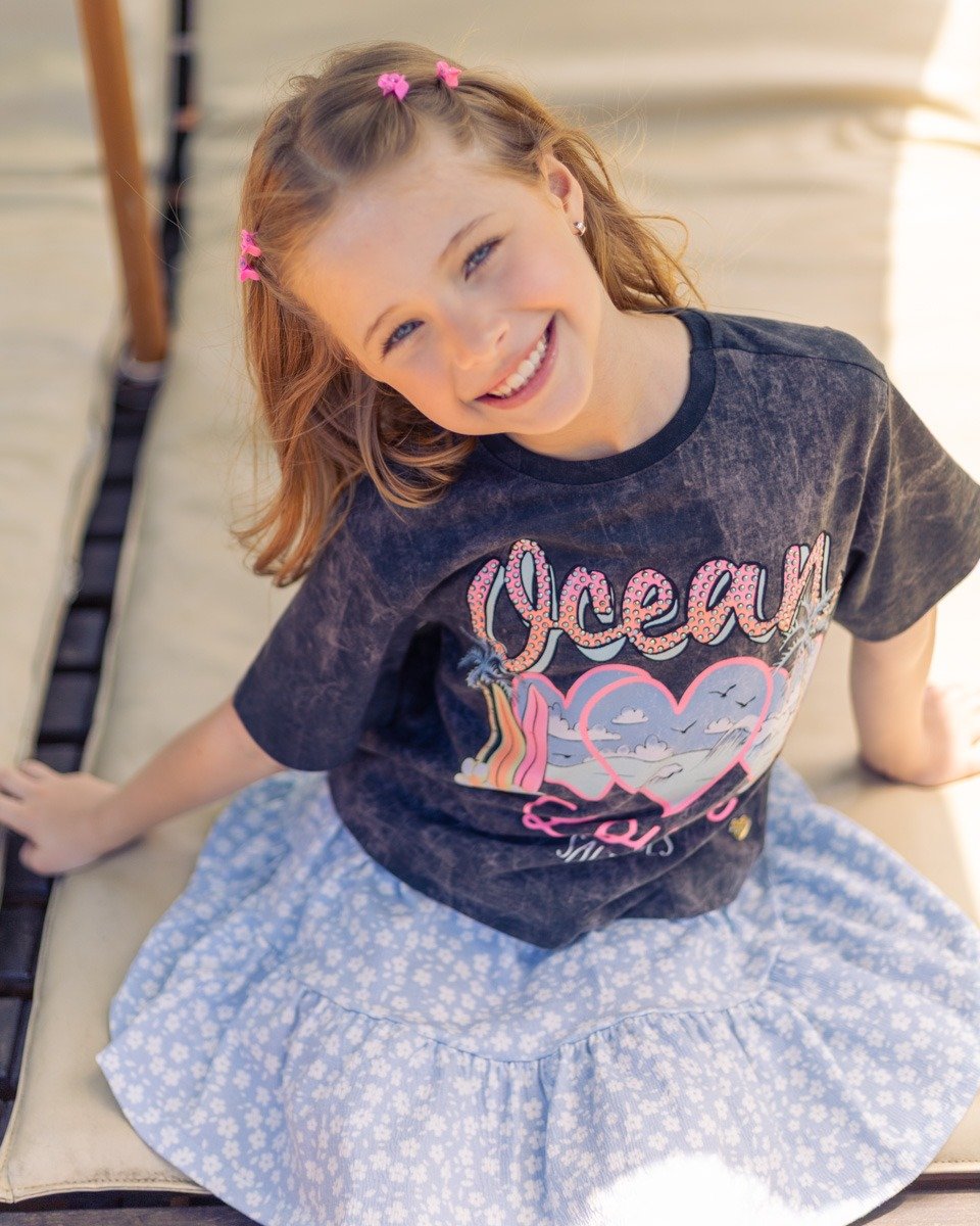 . Com estilo moderno e cheio de personalidade, esta blusa infantil traz uma malha estonada estilo mármore na cor cinza, que serve de base para um design inspirado no oceano. A estampa contém ondas, flores, pranchas e escrita temática, perfeita para transmitir a vibe do verão e da praia. O grande destaque vai para a palavra “Ocean” com aplicação de strass, que adiciona brilho delicado e sofisticado. As cores neon características da Plii dão energia e contraste vibrante à peça. Para finalizar, a blusa conta com a plaquinha de metal Plii no lado esquerdo de quem veste, reforçando exclusividade e autenticidade.