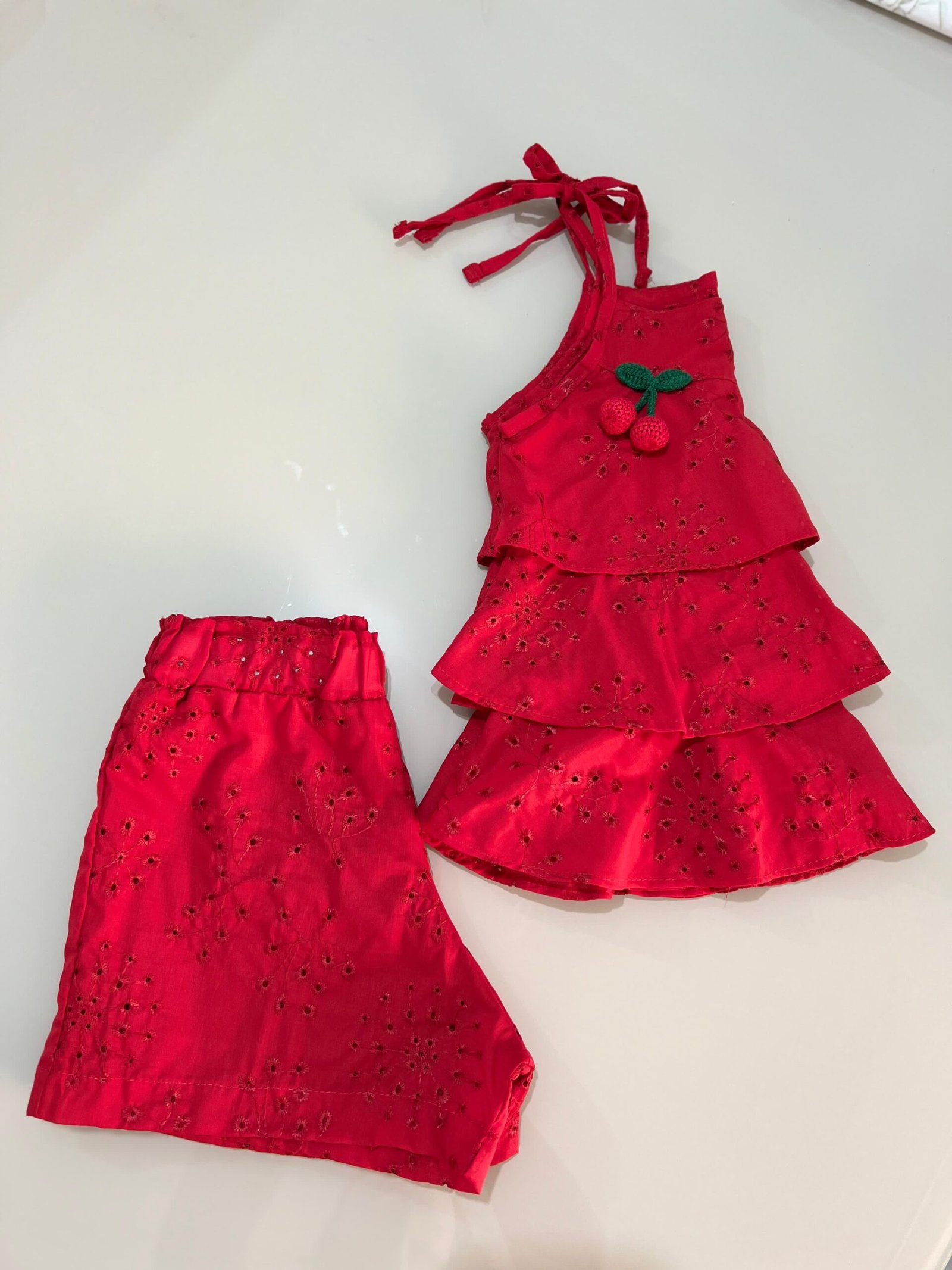 . Batinha toda em Marias, com amarração nos ombros e broche em formato de cerejinhas todo feito a mão;