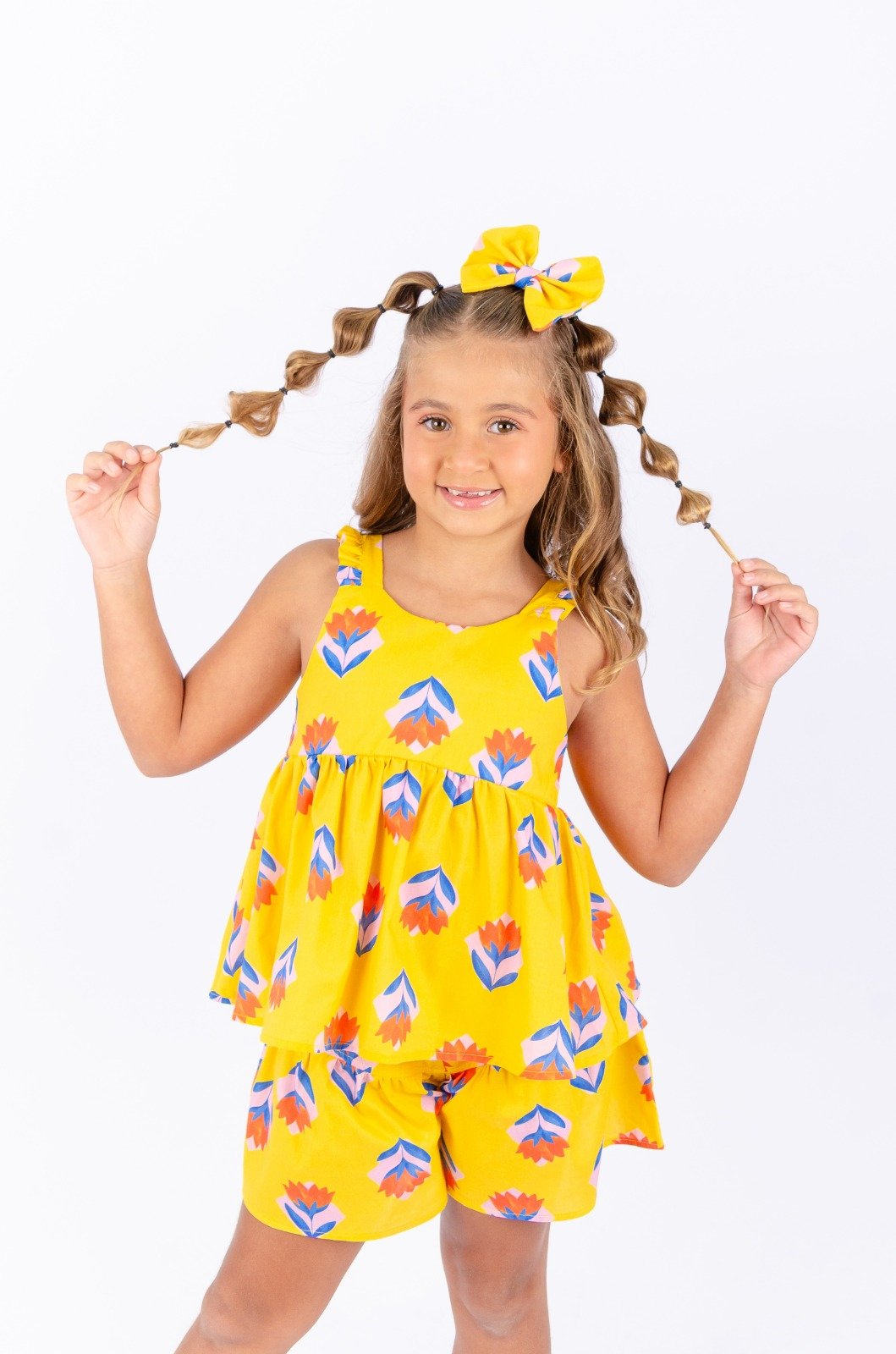 . Short modelo pregueado, com bolsos laterais e elástico na cintura;
