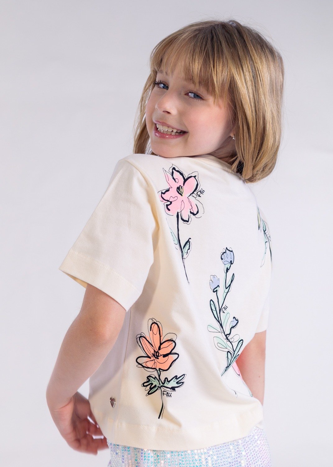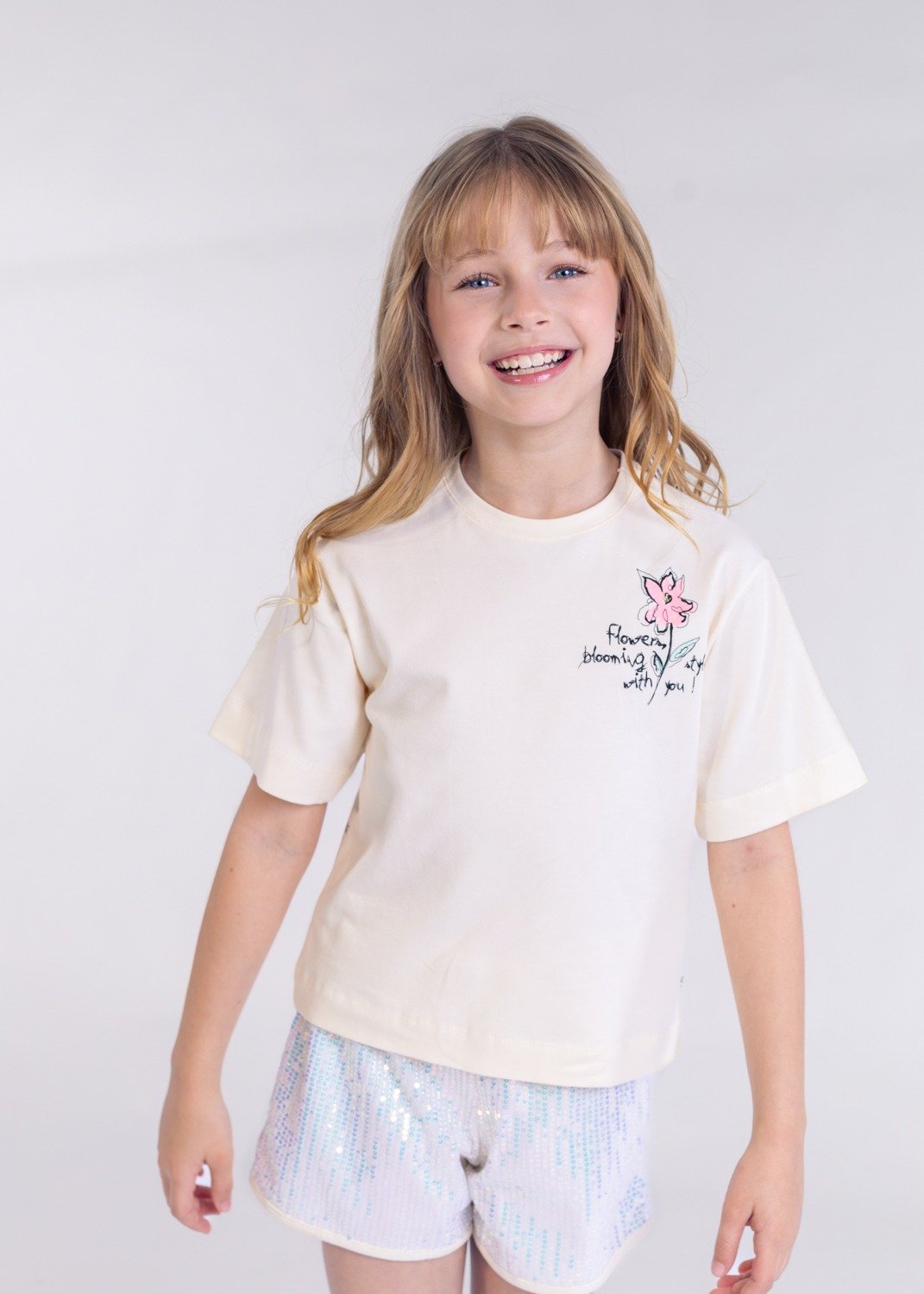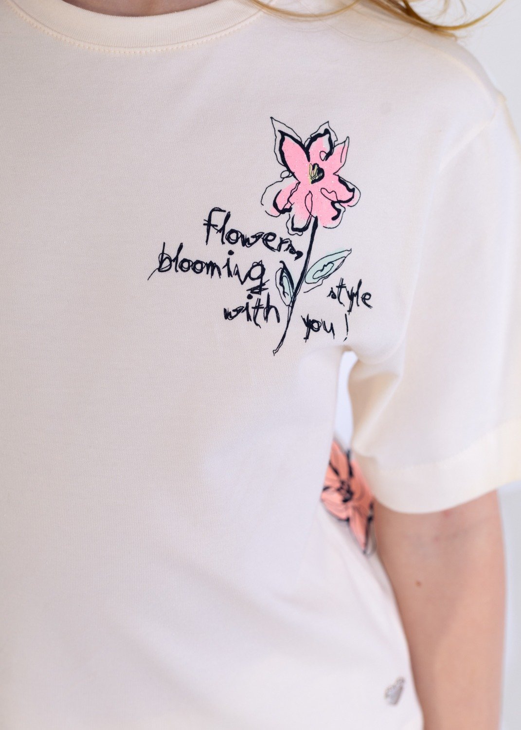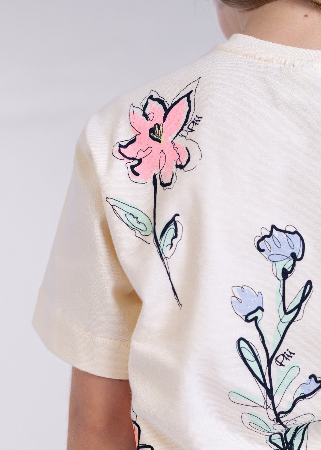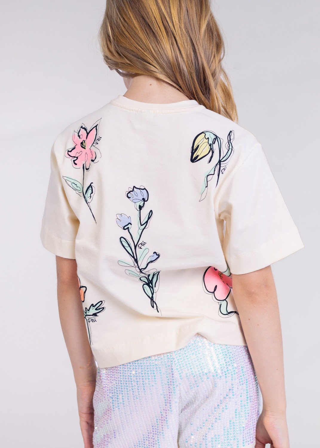 . Encantadora e moderna, esta blusa infantil traz uma estampa temática de flores na frente e nas costas, desenvolvida em um estilo artístico e abstrato, como se fosse feita por rabiscos estilizados. As pétalas ganham vida com cores vibrantes, como o rosa neon, criando um contraste alegre e divertido. O glitter aplicado na estampa adiciona brilho delicado, destacando ainda mais os detalhes florais. Na parte da frente, a estampa se completa com uma escrita estilizada no mesmo traço artístico das flores, formando um visual cheio de personalidade e charme.